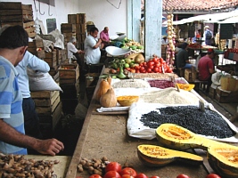 Verkaufsständen, an denen Feldfrüchte, Obst und Schweinefleisch