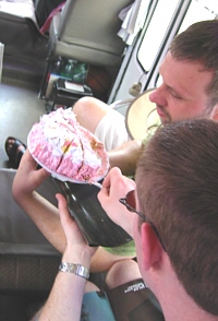 Während der Fahrt im Bus serviert Dirk - mangels Kuchenteller - jedem ein Stück auf den Seiten