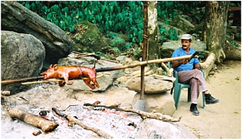 Rastplatz neben dem Wasserfall ein Spanferkel vom Grillspieß.