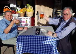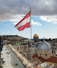 Eine Oase inmitten des Gassengewirrs ist das Österreichische Hospiz zur Hl. Familie in Jerusalem, seit 1863 das älteste nationale Gästehaus in der Heiligen Stadt. Den bis 1985 geführten Spitalbetrieb gibt es nicht mehr, die Pilgerherberge hat heute 45 Zimmer und 5 Schlafsälen. Ihm angegliedert ist ein Café-Restaurant. Und dort im Café Triest erwartet man uns zu einem "Großen Braunen" und Apfelstrudel. Fehlt nur noch, dass der Franzerl, Kaiser Franz-Joseph, am Nebentisch sitzt. Der Gründervater dieses Hauses blickt aber zumindest mit seiner Gattin Sissi aus dem Bilderrahmen auf die kleinen Kaffeehaustische.