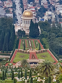 Friedenssymbol und Ort der Ruhe. Umgeben von saftig grünen Terrassengärten, ziegelroten Wegen und farbenfrohen Blumenbeeten erhebt sich der Schrein des Bab, des Religionsstifters des Babismus, einer Abspaltung der Schiiten, mit seiner goldenen Kuppel. Leider wird unser Ausblick auf die Bahai-Gärten durch Nebelwolken eingeschränkt. Nach einigen Minuten verziehen sich diese aber wie durch ein Wunder.