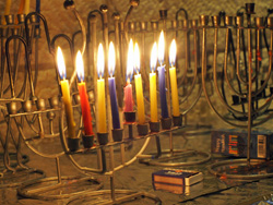 Menora- Leuchter, dessen Kerzen in den Hotels und Haushalten brennen. Rahel informiert uns über die Ursprünge dieses jüdischen Festes, mit dem die Befreiung ihres Volkes aus griechischer Herrschaft, die Wiedereinweihung des zweiten Tempels und ein Lichtwunder gefeiert werden.