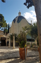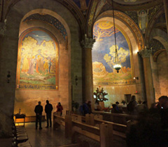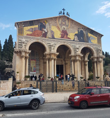 steht die römisch-katholische Kirche der Nationen, auch Todesangstbasilika genannt. Die Kirche wurde zwischen 1919 und 1924 mit Geldern aus zwölf Ländern, u.a. Deutschland, erbaut. Der Innenraum mit seinen violett gehaltenen Glasfenstern ist passend zum Thema Todesangst sehr düster. Unsere Augen müssen sich beim Betreten und Verlassen des Gotteshauses jeweils an die extremen Helligkeitsunterschiede gewöhnen.
