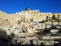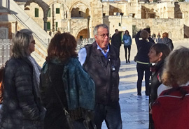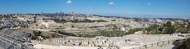 Wir beginnen unsere Stadterkundung Jerusalems auf dem Ölberg mit einem herrlichen Blick auf die Stadt. Die Altstadt von Jerusalem ist mitsamt Tempelberg nahezu komplett von einer fast fünf Kilometer langen Befestigungsmauer aus dem 16. Jahrhundert umgeben. Acht Tore führten in die Ewige Stadt. Die Altstadt, in der auf 1 qkm Fläche mehr als 20.000 Menschen leben, ist in ein jüdiches, muslimisches, christliches und armenisches Viertel geteilt.