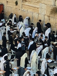 durch das Löwentor der historischen Stadtmauer und laufen über eine hölzerne Brücke, von der wir auf die betenden Gläubigen an der Klagemauer blicken können. Männer und Frauen sind in zwei Sektoren geteilt. Die tiefe Gläubigkeit und Ergriffenheit der Juden ist für uns beeindruckend. Sie beten an den unteren Mauerschichten des ehemaligen Salomonischen Tempels.