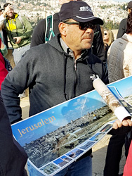Rahel macht uns auf einen behinderten Verkäufer von Panorama- Fotos der Ölberg- Aussicht aufmerksam, von dem einige von uns sein Angebot zum Kauf annehmen. Danach spazieren wir gemeinsam auf dem Palmsonntagsweg hinab und passieren den großen jüdischen Friedhof, noch heute eine begehrte Ruhestätte erster Klasse. Dem Glauben nach sind die hier Beerdigten dem Messias bei seiner Ankunft besonders nah. Anders als im Christentum werden jüdische Tote nicht aufgebahrt, sondern so schnell wie möglich beerdigt - und auch nicht in einem Sarg, sondern nackt in ein Leichentuch gewickelt. Auf die Grabplatten legt man statt Blumen kleine und etwas größere Steine.