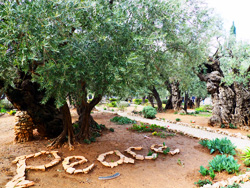 Wir erreichen die Kirche Dominus Flevit ("der Herr weinte"), die dem Franziskaner- Orden gehört. Sie soll an die Trauer Jesu im Wissen um die kommende Zerstörung Jerusalems erinnern. Weiter geht es in den Garten von Gethsemane mit seinen Jahrhunderte alten Olivenbäumen. Der älteste Olivenbaum soll 900 Jahre alt sein. So haben es jüngst italienische Wissenschaftler festgestellt. Dies ist der Ort, wo Jesus Christus in der Nacht vor seiner Kreuzigung betete, ehe er von Judas Iskariot verraten und von Abgesandten des Hohepriesters verhaftet wurde.