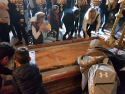 Von Weihnachten bis zum Fest der Hl. Drei Könige liegt ein hölzernes Jesulein in der daneben liegenden Krippengrotte. Die Krippe wird vor Berührungen durch die Gläubigen von einem Drahtkäfig geschützt. Hier soll das neugeborene Jesuskind in den Futtertrog im Stall gelegt worden sein. Ich beobachte tiefgläubige Christen, die ehrfürchtig und demütig die heiligen Stellen küssen.