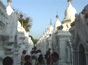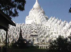 Dann geht es in den Himmel oder besser zur Hsinbyume Pagode, die mit ihren gewellten Terrassen die buddhistische Kosmographie symbolisiert - der Berg Meru als Zentrum der Welt! Unsere Reiseleiterin verteilt Fotokopien einer Zeichnung, die das mystische Weltbild verdeutlicht. Danach besteht der Berg Meru aus 8 Höllen, 4 Sockelzonen und 2 (der insgesamt 6) niederen Himmel.
