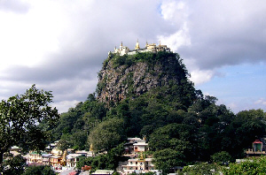 Dann kehrt die Gruppe vom Gipfelsturm auf den Mount Popa zurück. Die Mühsal des Aufstiegs soll übrigens zu einer Verbesserung des persönlichen Karmas beitragen. Dieser Effekt bleibt mir leider verwehrt. Man habe dort oben einen schönen Rundblick über die Umgebung, der aber leider heute ziemlich diesig sei, so die Bergbezwinger. Nach dem Besuch der bedeutenden Pilgerstätte genießen wir beim Lunch die Aussicht von der Anlage des Mount Popa Resorts, ein sehr geschmackvolles Hotel in der wilden Berglandschaft, das vor nicht einmal 10 Jahren von Australiern und Burmesen gebaut wurde. Von hier hat man einen tollen Ausblick auf den Mount Popa und das Gipfelkloster auf dem Gipfel. Das Bild erinnert zwangsläufig an Neuschwanstein. Der Kini hätte wohl auch seine Freude daran gehabt.