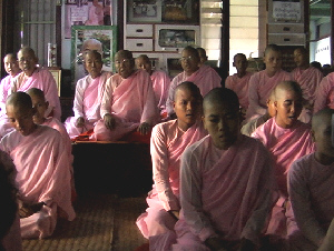 Frauen dürfen sich nur bis zu einem abgetrennten, 6 m entfernten Bereich hinter den Mönchen nähern. Man könnte daraus schließen, dass die Frauen in Myanmar gegenüber den Männern benachteiligt seien. Dies gilt jedoch nur in religiöser Hinsicht. Die Frau kann nach der Lehre zwar ins Nirwana kommen, aber nicht als Buddha zurückkehren. Jede Burmesin wünscht sich daher, bei ihrer nächsten Geburt als Mann zur Welt zu kommen, weil nach buddhistischer Überzeugung die Geburt als Frau das Ergebnis eines weniger guten Lebenswandels im letzten Leben ist. Verfassungsrechtlich ist die Frau dem Mann jedoch gleichgestellt und angeblich genießen die Frauen in Myanmar sogar die größte Freiheit in ganz Asien.