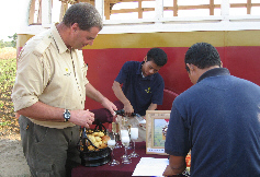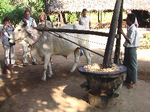 Offensichtlich ist dieser Bauernstand ein Standard- Stopp für Touristen. Ich habe den Eindruck, dass der Bauersmann eine Show für uns abzieht. Mit einem Zebu mahlt er Erdnusskerne zu Öl. Er zeigt uns, wie man Palmyras, Zuckerpalmen, melkt und so den süßen Saft gewinnt, mit dem er dann Palmschnaps brennt. Den bietet er uns zum Kosten an. Achtung, Erblindungsgefahr!
