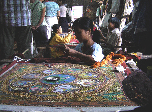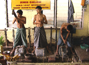 Ein geballtes Tages- Programm steht uns bevor. Beginnen wollen wir mit dem Besuch eines Handwerksbetrieb zur Blattgoldherstellung, einer Goldschlägerwerkstatt. Ein Goldkügelchen wird zwischen Hirschlederlappen gelegt und mit schweren Hämmern hauchdünn geschlagen. Eine Knochenarbeit, die junge kräftige Männer ausführen. Zum Schluß wird der entstandene Hauch von Blattgold vorsichtig in einem abgeschlossenen Raum in Ölpapier verpackt. Das Blattgold ist so dünn und leicht, dass es beim leisesten Windhauch wegfliegen könnte. Die Maufakturen verkaufen die Päckchen an die Gläubigen, die das Blattgold den Buddhastatuen aufkleben.