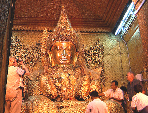 Einige von uns kaufen ein Goldpäckchen für die nächste Station unseres Programms. Denn nun besuchen wir das zweitwichtigste Heiligtum des Landes, die Mahamuni oder Arakan Pagode. Sie liegt am Weg nach Amarapura, der Stadt, die vor Mandalay die Hauptstadt des alten Reiches war.