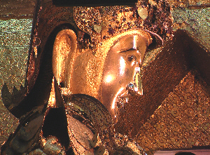 Im Inneren der Pagode steht die vermutlich älteste (146 n.Chr.) und größte (ca 4 m groß) bronzene Buddhastatue Myanmars. Das Gesicht der Statue soll eine der 5 wahrheitsgetreuen Darstellungen Buddhas sein. Nachdem die große Statue gegossen war, soll Buddha sie angehaucht haben, worauf sie zum exakten Ebenbild des Gesegneten wurde. Das Gesicht der Statue darf nur vom Abt des Klosters berührt werden und wird im Rahmen einer täglichen Morgenzeremonie von ihm gewaschen. Ansonsten dürfen sich dem Bronzebuddha nur Männer (auch Touristen) nähern und diesen über und über mit Blattgold