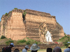 (Irrawaddy) zu dem ca. 11 km stromaufwärts liegenden Dorf Mingun fahren. Hier hatte 1790 der größenwahnsinnige König Bodawpaya mit dem Bau der größten Pagode des Reiches begonnen. Sie sollte auf einer Fläche von 150 m x 150 m eine Höhe von ebenfalls 150 m erreichen. Als der König starb hatte sie eine Höhe von 50 m erreicht. Seine Nachfolger stellten die Bauarbeiten ein. Der mächtige, festungsartige Bau wurde aus Ziegeln errichtet. Deren Instabilität führte bei späteren Erdbeben zu Zerstörungen, die noch heute sichtbar sind. Davon waren auch die beiden riesigen Chinthes, Löwenstatuen als Pagoden- Wächter, am Flußufer betroffen. Hiervon sind nur noch Reste zu erkennen.