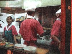 Abends essen wir in einem thailändischen Restaurant. Hier können wir den Köchen durch eine Glasscheibe bei der Zubereitung der Speisen zusehen. Allerdings ist nur die Hälfte der Gruppe mitgekommen. Der Rest laboriert am bereits erwähnten MD- Virus. Dafür leisten uns zwei junge Frauen, ehemalige Schülerinnen der PDO- Schule, Gesellschaft. Eine der beiden war auf Einladung ihrer Pateneltern bereits dreimal in Deutschland. Beide haben gute Deutschkenntnisse und erzählen von ihrem täglichen Leben.