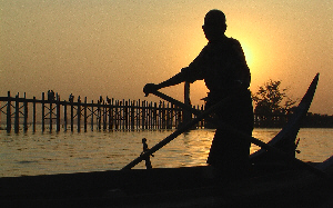 Letztes Tagesziel ist Amarapura, und dort die U Bein Brücke. Sie ist mit 1.200 m die längste Teakholzbrücke der Welt und führt über den Taungthaman See. Ich überquere mit den Einheimischen die Brücke per pedes und lasse mich dann von einem der zahlreichen Ruderboote zurück in den Sonnenuntergang rudern. Genial! Und viele tolle Fotomotive...