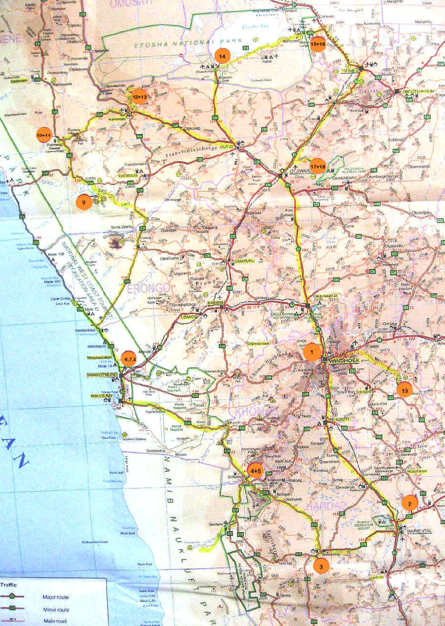 (die nummerierten Punkte kennzeichnen die Lage der Tagesunterkünfte)