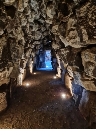 Loch, in dem eine Treppe mit 25 glattgeschliffenen Basalt- Stufen durch einen Gang hinab zum runden Brunnen führt. Über diesem ragt ein flaschenförmiges Gewölbe. Es endet in einem kaminartigen Steinschlauch, durch den Licht auf das Wasser fällt. Manche Beschreibungen vergleichen die Anlage mit einer gigantischen Vagina bzw. Vulva, andere mit einem Schlüsselloch.