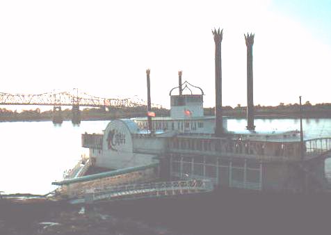Uferviertel "under the hill". Hier liegt das einem Schaufelraddampfer nachempfundene Casino der "Isle of Capri"- Kette, das wir auf den ersten Blick für ein richtiges Schiff halten. Doch wir sind keine "gambler", uns interessiert eher die Abendstimmung am Fluß. Nur wenige alte Häuser stehen hier noch, z.B. der Under the Hill Saloon und das Wharfmaster Restaurant, und lassen ahnen, wie es damals hier zuging mit Sklavenmarkt, Huren und Matrosen.